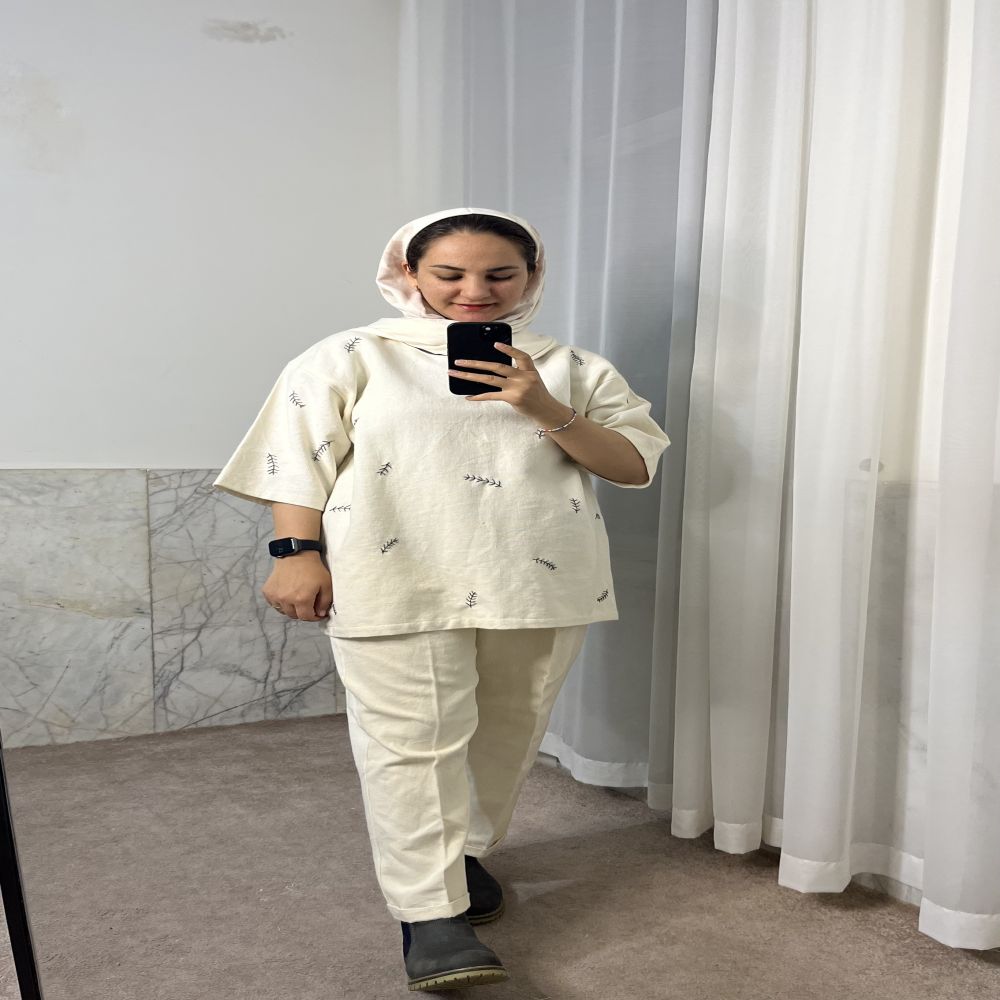 گلدوزی طرح برگ بهصورت کاملاً دستی و با جزئیات ظریف انجام شده و به لباس جلوهای هنری و منحصربهفرد میدهد. هیچ دو تیشرتی دقیقاً مشابه نیست — هر کدام یک اثر هنری مخصوص خود است.